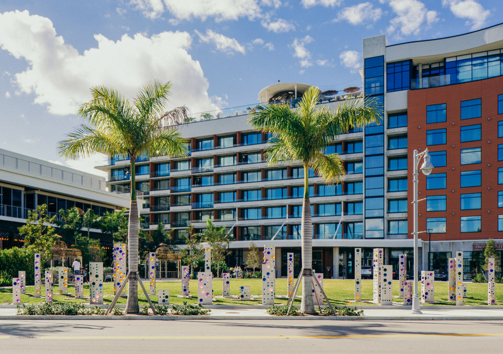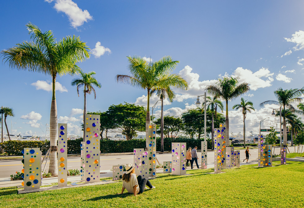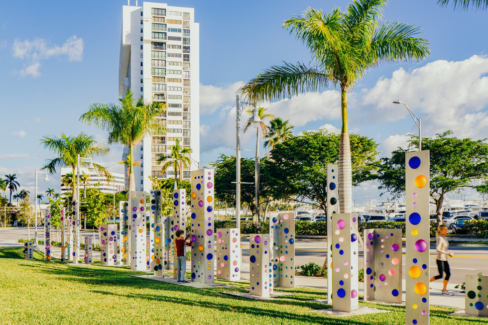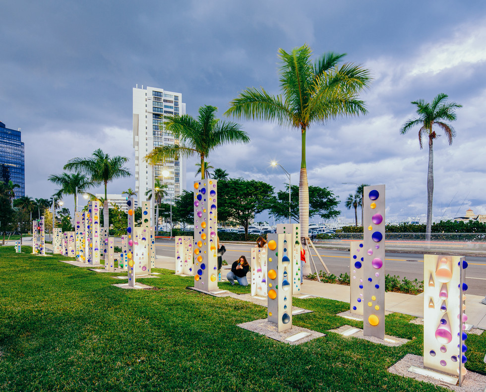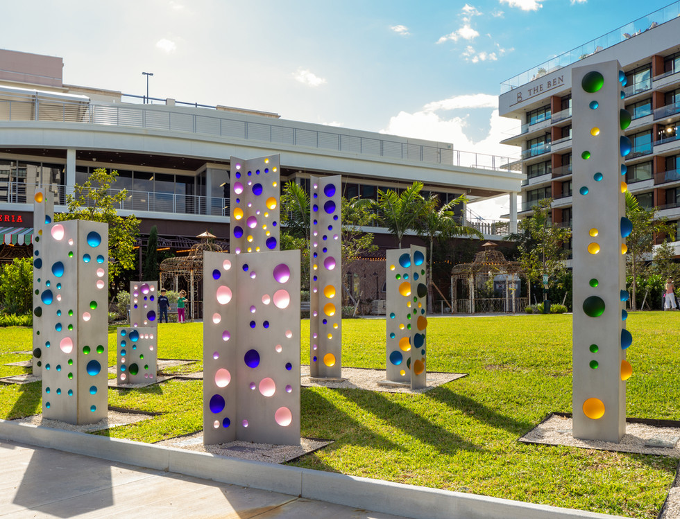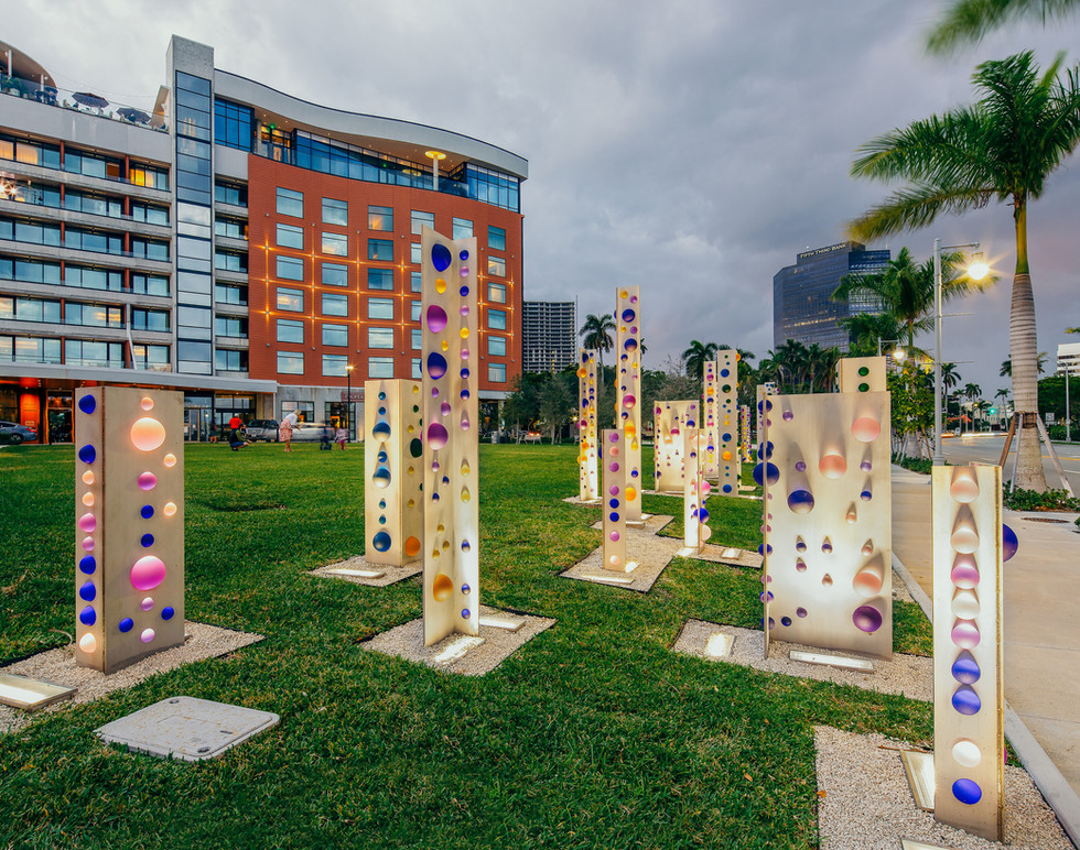 Codes, 2019. stainless steel, etched glass spheres, LED lighting – Series covers 90’ x 15’ – Individual panels vary